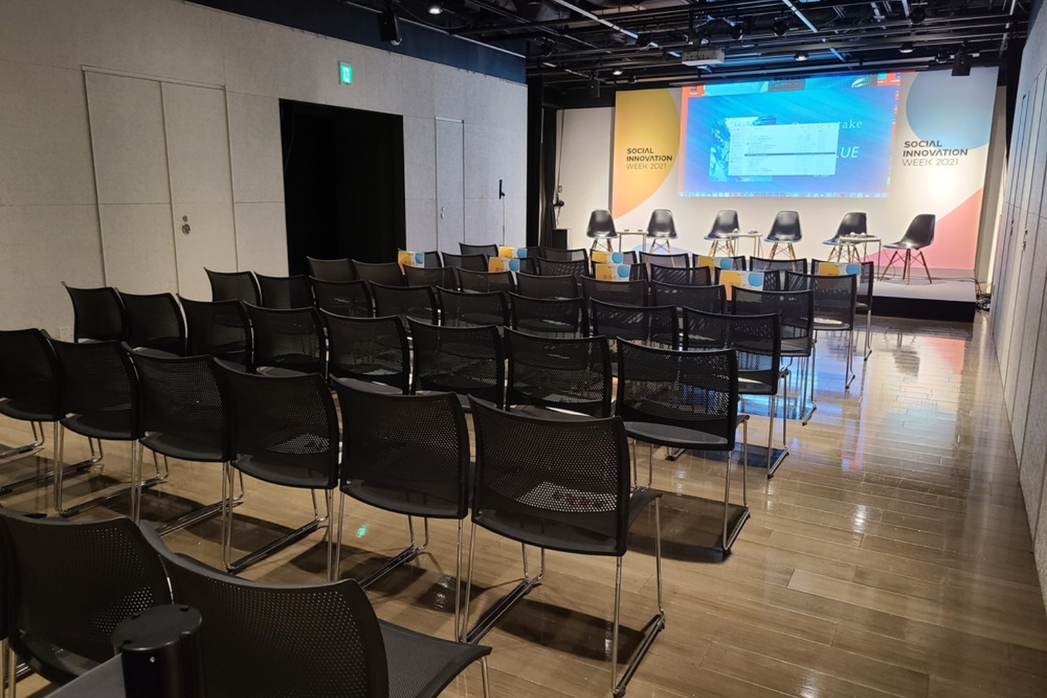 屋内/190㎡/最大収容人数121名シアター形式:約104席 セミナー形式:約54席